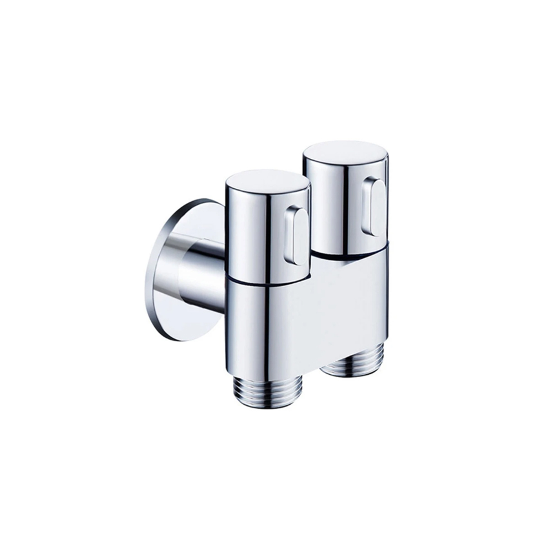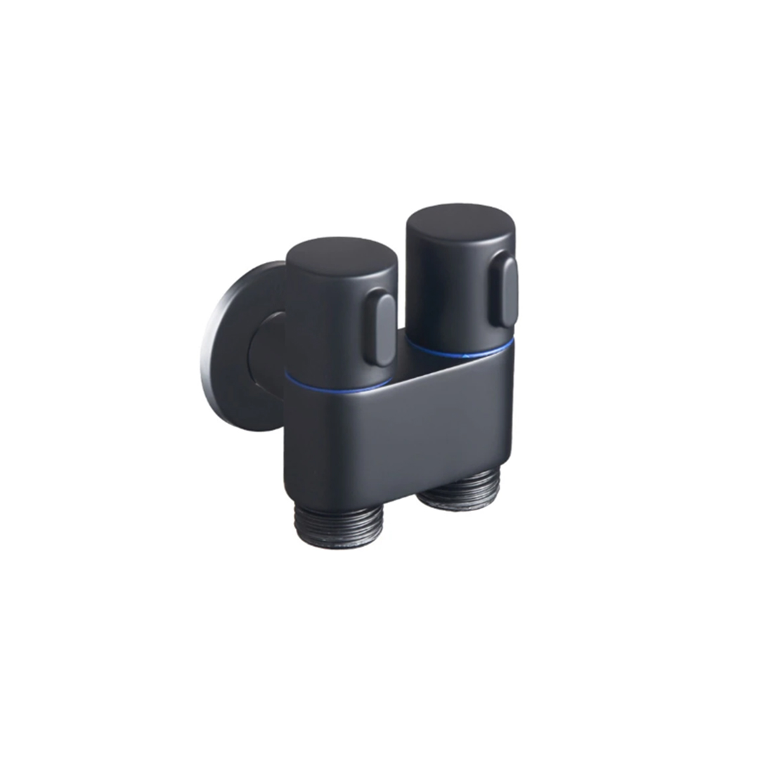 محبس زاوية مسكتين مخرجين الكروم والاسود  بتصميم مبتكر  , من مواد عالية الجودة مصنوعة من معدن عالي الجودة ومقاوم للتأكل ومقاومة للصداء والكسر ومتينة , صمامات إغلاق مستقلة , صنبور بمفتاح مزدوج للماء البارد والحار ، يمكن استخدامها في نفس الوقت دون التأثير على بعضها البعض ,  لتجربة استحمام مختلفة , صمامات تحكم مزدوجة ذات مدخل واحد ومخرجين